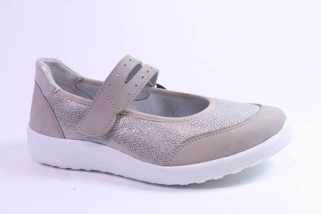 Promenadsko i ballerinamodell i beige mocka och vit sula från ACO. Det har en bred läst och uttagbara sulor med plats för egna inlägg. Vristrem ovan som justeras med kardborre.