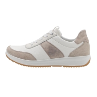 Promenadsko i vitt skinn med beige mockadetaljer från Ara. Den har snörning och en dragkedja på insidan. Uttagbara sulor med plats för egna inlägg. Bred läst.