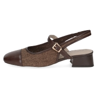 Brun sandalett i slingback modell med hel tå från Caprice. Den har en liten klack och en ställbar rem över vristen.