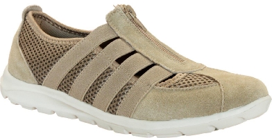Promenadsko i beige mocka/textil från CC Resort. Den har en dragkedja på ovansidan och resårer på sidorna. Uttagbara sulor med plats för egna inlägg.