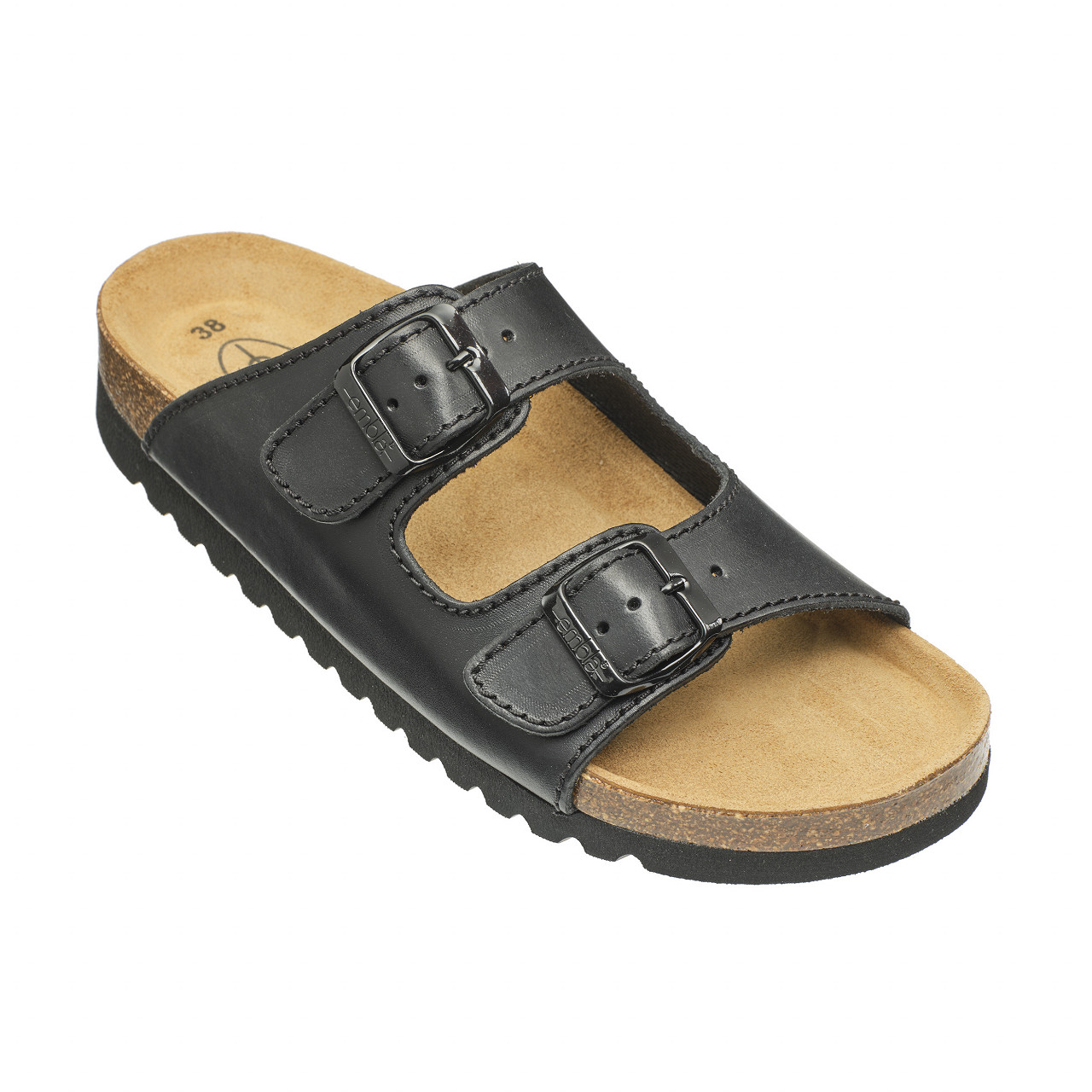 Slip-in toffel i svart skinn från Embla. Justerbara remmar med spännen över foten Normal läst.
