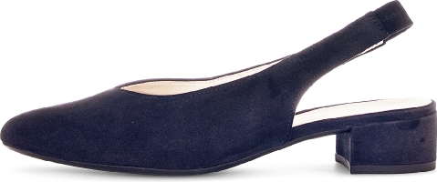 Sandalett/Slingback i mörkblå mocka från Gabor. Enkel att ta på, resår längst bak på remmen. Gummisula.
