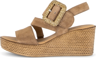 Sandalett i ljusbrun mocka från Gabor. Den är på kilklack med knäppe på utsidan, kardborre under spännet.