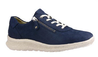 Promenasko i blå nubuk med ljus sula från Hartjes. Löstagbara innesulor med plats för egna inlägg och med både snörning och dragkedja. Bred läst, k-vidd.
