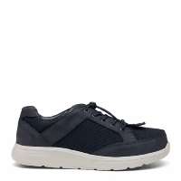 Promenadsko från New Feet i blå mocka med ljus sula. Den har elastisk snabbsnörning och uttagbara sulor med plats för egna sulor. Bred läst.
