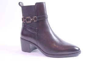 Mörkbrun skinnkänga på klack från ParkWest. Den har en dragkedja på insidan och ett dekorativt spänne i guld på utsidan. Gummisula.
