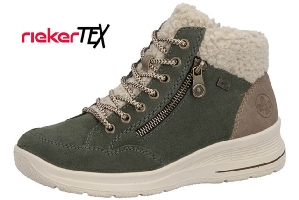 Varmfodrad känga från Rieker i grön mocka och brunt bakstycke. Snörning och även dragkedja på insidan. Dragkedjan på utsidan är en detalj som prydnad.
