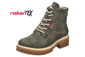 Grön känga från Rieker med både dragkedja och snörning. Löstagbara innesulor, varmfodrad och med kraftig sula