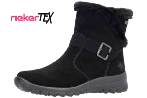 Svart varmfodrad känga i mocka från Rieker. Känga med Riekers vattenavisande material rieker-tex, dragkedja och mönstrad slitsula.