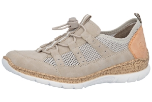 Luftig promenadsko i beige ovandel med aprikos detalj på bakkappan från Rieker. Reglerbar resårsnörning.
