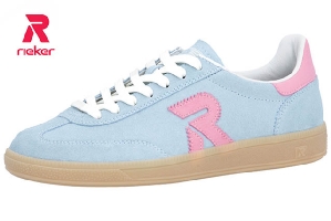 Sneakers i ljusblå mocka med rosa detaljer från Rieker. Den har snörning och uttagbara sulor med plats för egna inlägg.