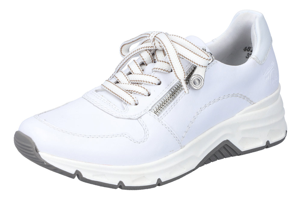 Promenadsko i vitt från Rieker. Den har snörning och en dragkedja på utsidan. Uttagbara sulor med plats för egna inlägg.