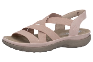Sandal från Rieker i ljus rosa ovandel och beige sula. 3 remmar resår över vristen gör den enkel att ta på och av. Bara dra på.