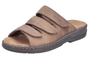 Slip-in i brunt oljat skinn från Rieker. Den är ställbar med tre remmar ,kardborre. Uttagbara sulor med plats för egna inlägg.