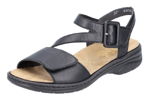 Svart sandal i skinn från Rieker. Båda remmarna justeras med kardborre. Uttagbara sulor med plats för egna inlägg.