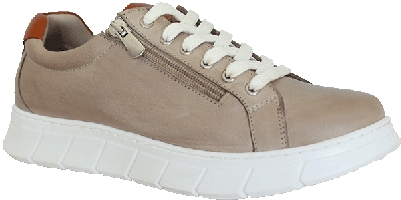 Promenadsko i mörkbeige ovandel med vit sula från Rosa Negra Comfort. Den har snörning och en dragkedja på utsidan. Uttagbara sulor med plats för egna inlägg. Bred läst H-vidd.