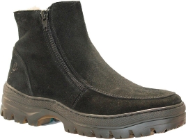 Lammullsfodrad vinterkänga i svart mocka från Rosa Negra. Den har två dragkedjor och uttagbara sulor med plats för egna inlägg. Vändbara broddar på både sula och klack för hala dagar.