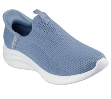 Promenadsko i blå Textil med stretch och vit sula från Skechers. Lätt att ta på utan skohorn med Slip-ins.