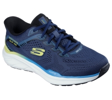 Promenadsko med blå bas och färgade ditaljer och vit sula från Skechers. Lätt att ta på utan skohorn med Slip-Ins.