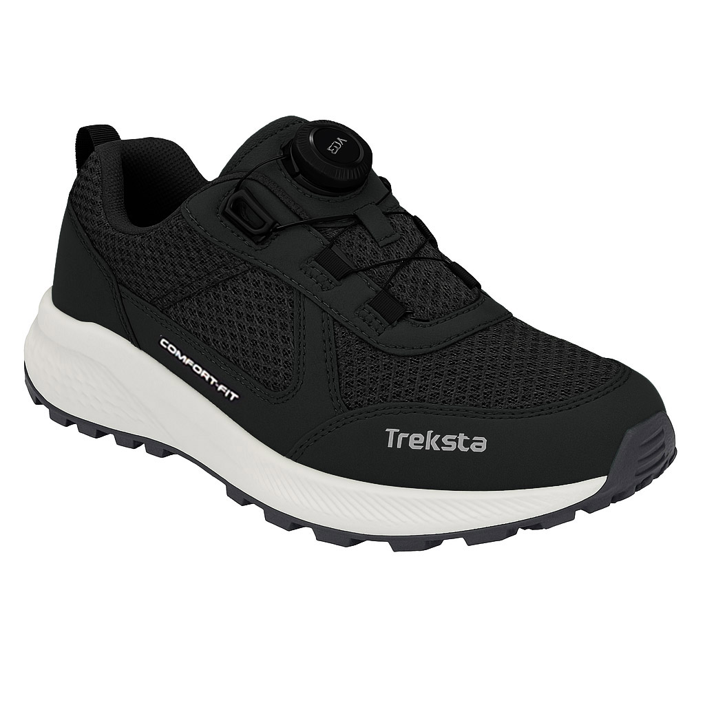Walkingsko i svart textil med Tex material för vattentäthet. Boa skruv snörning. Mjuk svikt i den vita sulan, något bredare läst.